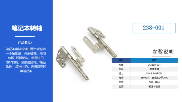 推薦2-經(jīng)典筆記本轉(zhuǎn)軸238-001,筆記本電腦轉(zhuǎn)軸由兩個鈑金件一個軸組成,外表鍍鎳,采用包圓+壓鉚結(jié)構(gòu),使用進口SK7材質(zhì),帶限位結(jié)構(gòu)。軸徑5MM,結(jié)構(gòu)小巧,適用各類輕薄筆記本及工業(yè)筆記本顯示器