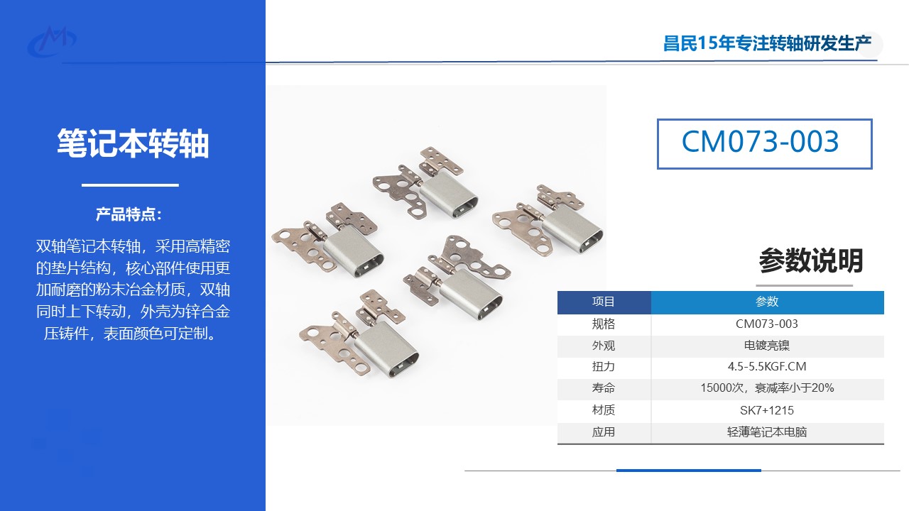 隨著筆記本電腦更輕、更薄的發(fā)展,轉(zhuǎn)軸的結(jié)構(gòu)設(shè)計(jì)也在不斷變化。筆電轉(zhuǎn)軸是典型的活動(dòng)部件,既要承受彎矩又要承受扭矩,對(duì)開(kāi)合體驗(yàn)起了決定性的影響,從隱藏在筆記本電腦中的經(jīng)典墊圈結(jié)構(gòu)轉(zhuǎn)軸到現(xiàn)在帶殼的齒輪結(jié)構(gòu)轉(zhuǎn)軸,筆記本電腦在翻轉(zhuǎn)時(shí)可以靈活地切換角度,更便于攜帶。目前我們經(jīng)常可以看到帶殼的筆記本電腦轉(zhuǎn)軸,這樣的結(jié)構(gòu)設(shè)計(jì)有有什么功能和優(yōu)勢(shì)呢?今天昌民小編就帶大家了解一下。
